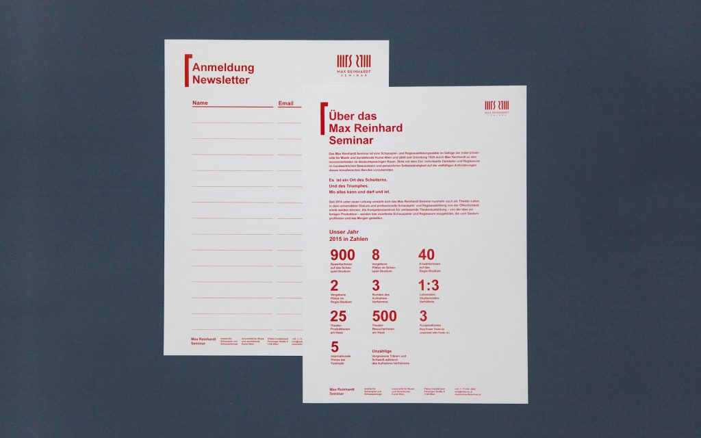 BrandingDas Max Reinhardt Seminar gilt als eine der legendärsten Kaderschmieden der deutschsprachige Schauspielkunst. Aufgenommen zu werden ist für die meisten aufstrebenden Schauspieler der größte Glücksfall und wir müssen zugeben: Auch wir haben uns gefreut, das Corporate Design für diese namhafte Institution entwickeln zu dürfen. Die Bildmarke wurde sanft überarbeitet, die Wortmarke prominenter und besser lesbar, die neue Logotype geht auf die Gründungszeit des Reinhardt Seminars ein.