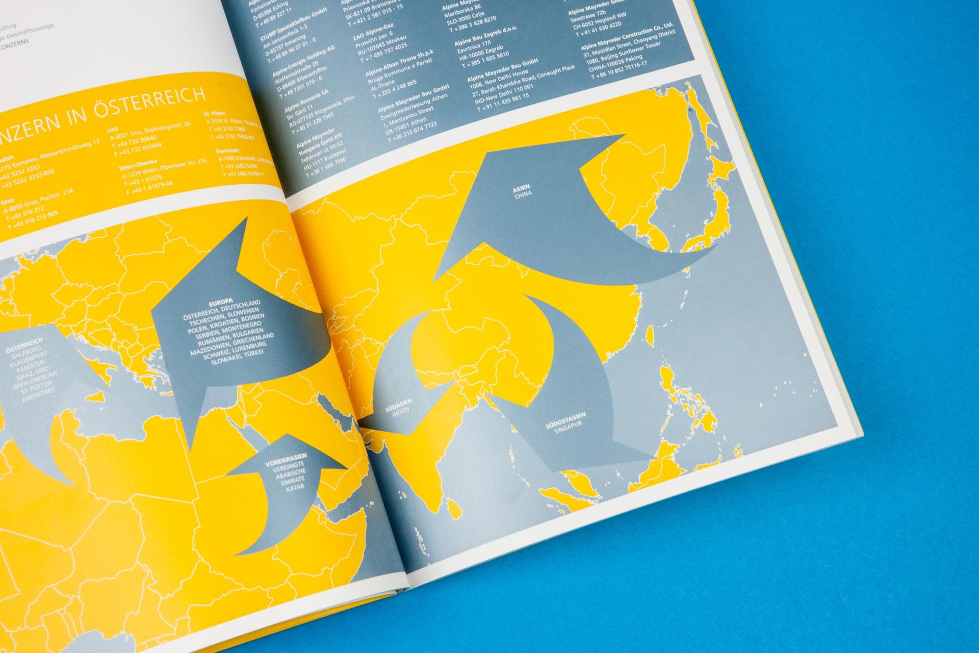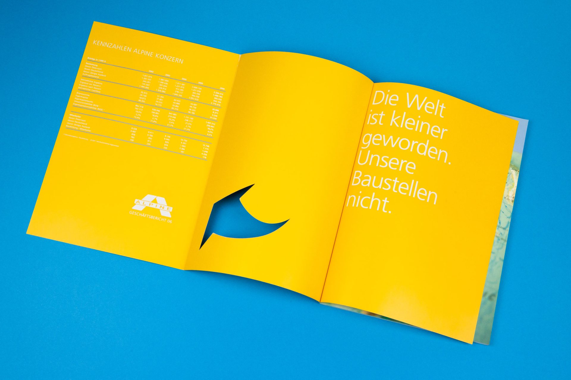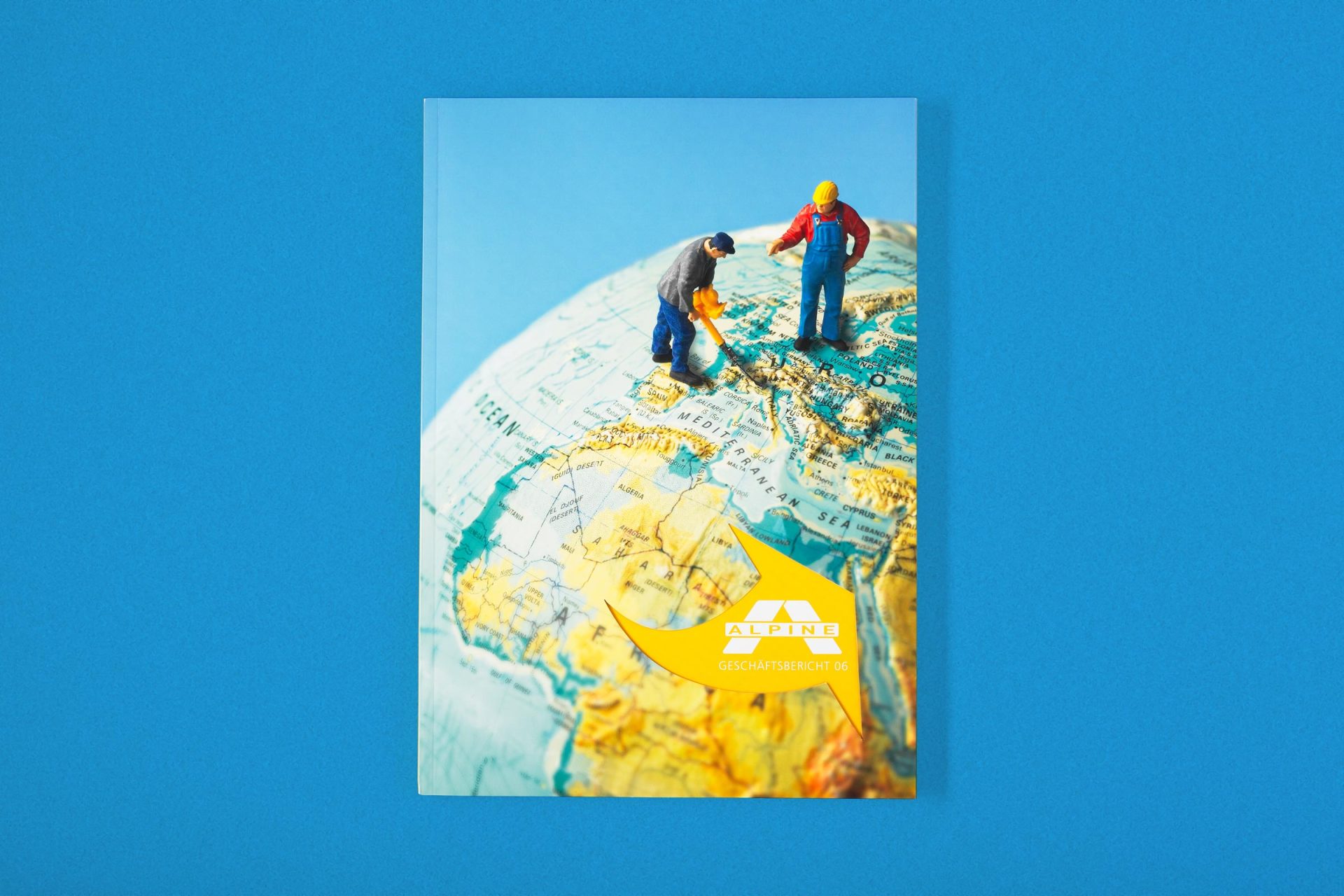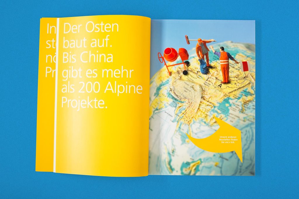 Die Alpine Holding GmbH bildete mit der Alpine Bau GmbH eine Baugruppe mit Sitz in Wals bei Salzburg, deren Kapital vom spanischen FCC-Konzern gehalten wurde. Über Jahre war die Alpine mit einer Bauleistung von rund 3,5 Mrd. Euro und 15.530 Mitarbeitern der zweitgrößte Baukonzern Österreichs mit einem internationalen Wirkungsradius vom nahen Osten bis nach Fernost. Von 2006 bis 2008 durfte Alessandri Design die Geschäftsberichte für den Bau-Giganten konzipieren und gestalten. Bei diesem hier illustrierten wir die weltweite Tätigkeit mit einem Globus – und mit Mini-Figuren wie man sie aus Modellbausätzen kennt.