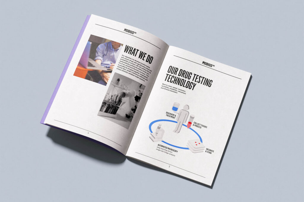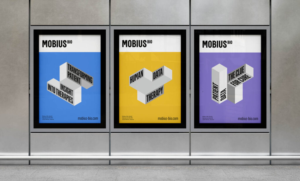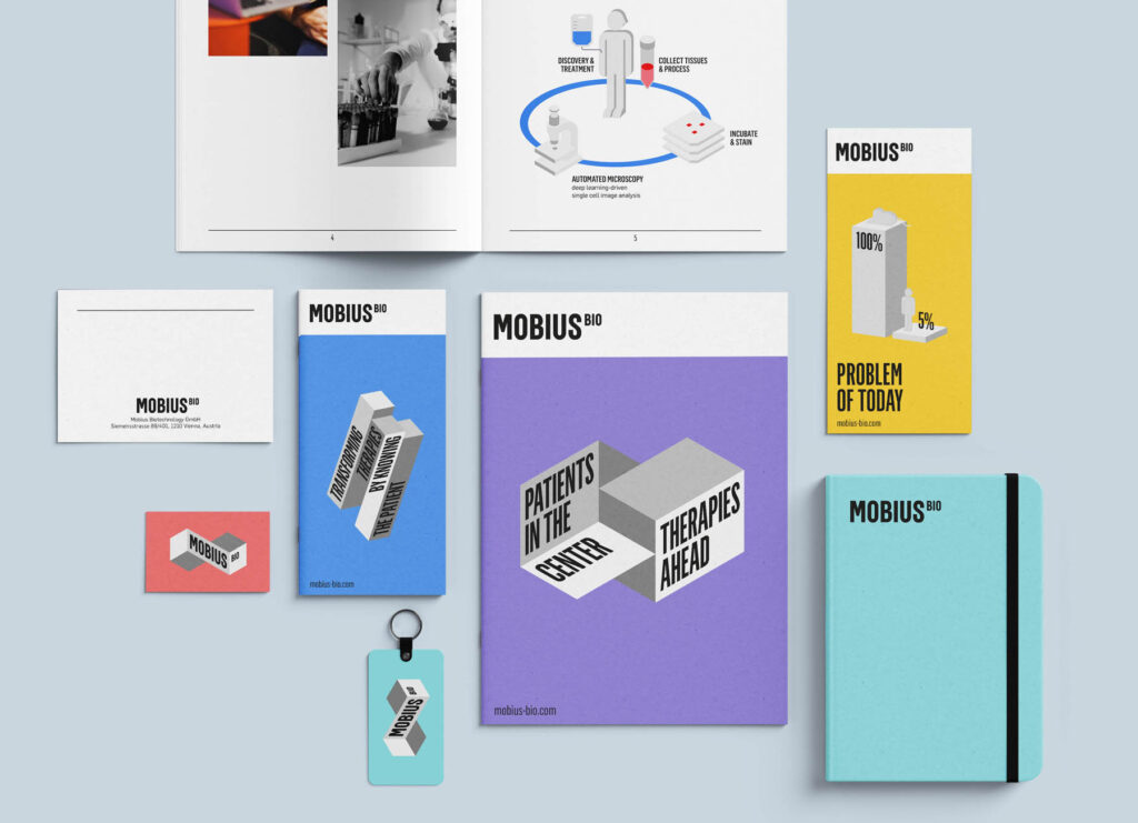 BrandingWas für eine unendlich sinnvolle Aufgabe. Moebius (wir entwickelten auch den Namen) entwickelt neue Krebsmedikamente auf Grundlage lebender menschlicher Gewebeproben. Das tiefe Verständnis der neuen Unternehmer für die menschliche Biologie spornte auch uns an, an einer starken CI zu forschen. Inspiriert durch die unendliche Mobius Schleife ist es uns gelungen, eine modulare Formensprache zu entwickeln, die mit ihren Perspektiven, Blickwinkeln und positiven Farben visuell so verlockend ist, dass jeder drauf geworfene Blick – wenn er möchte – sich unendlich lange darin verfangen kann.