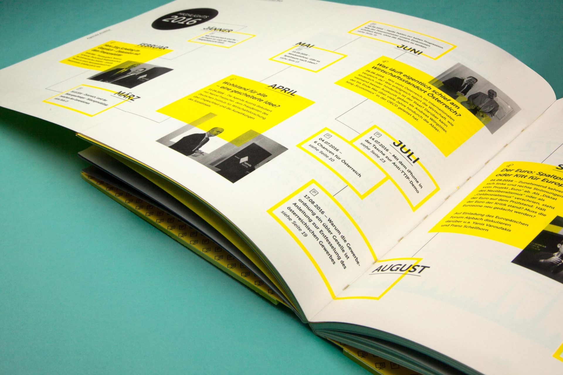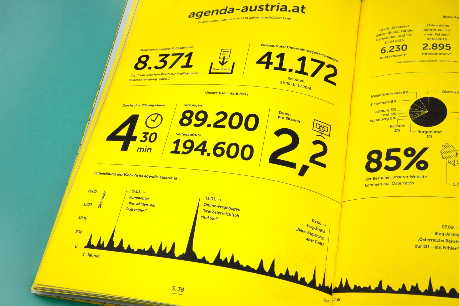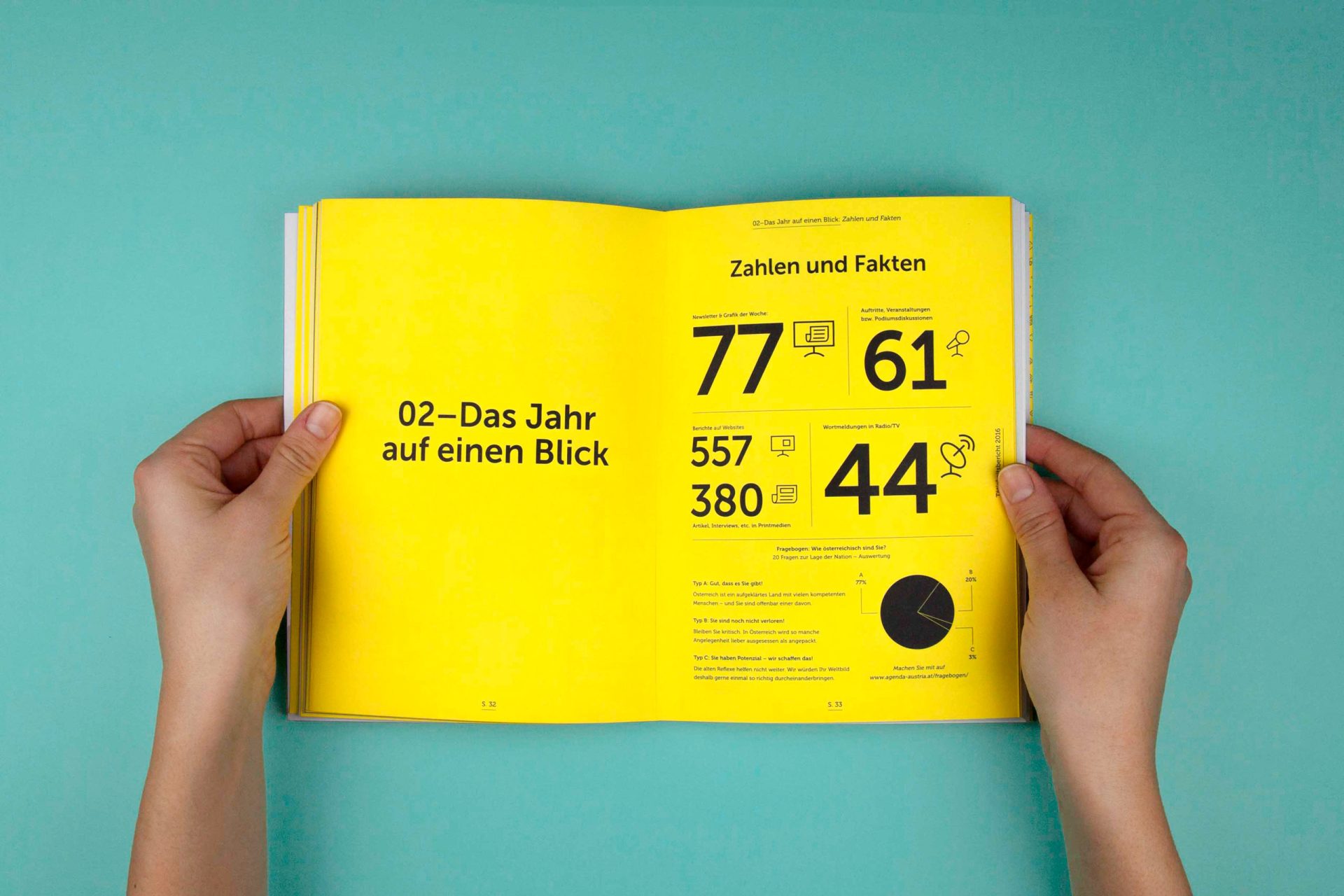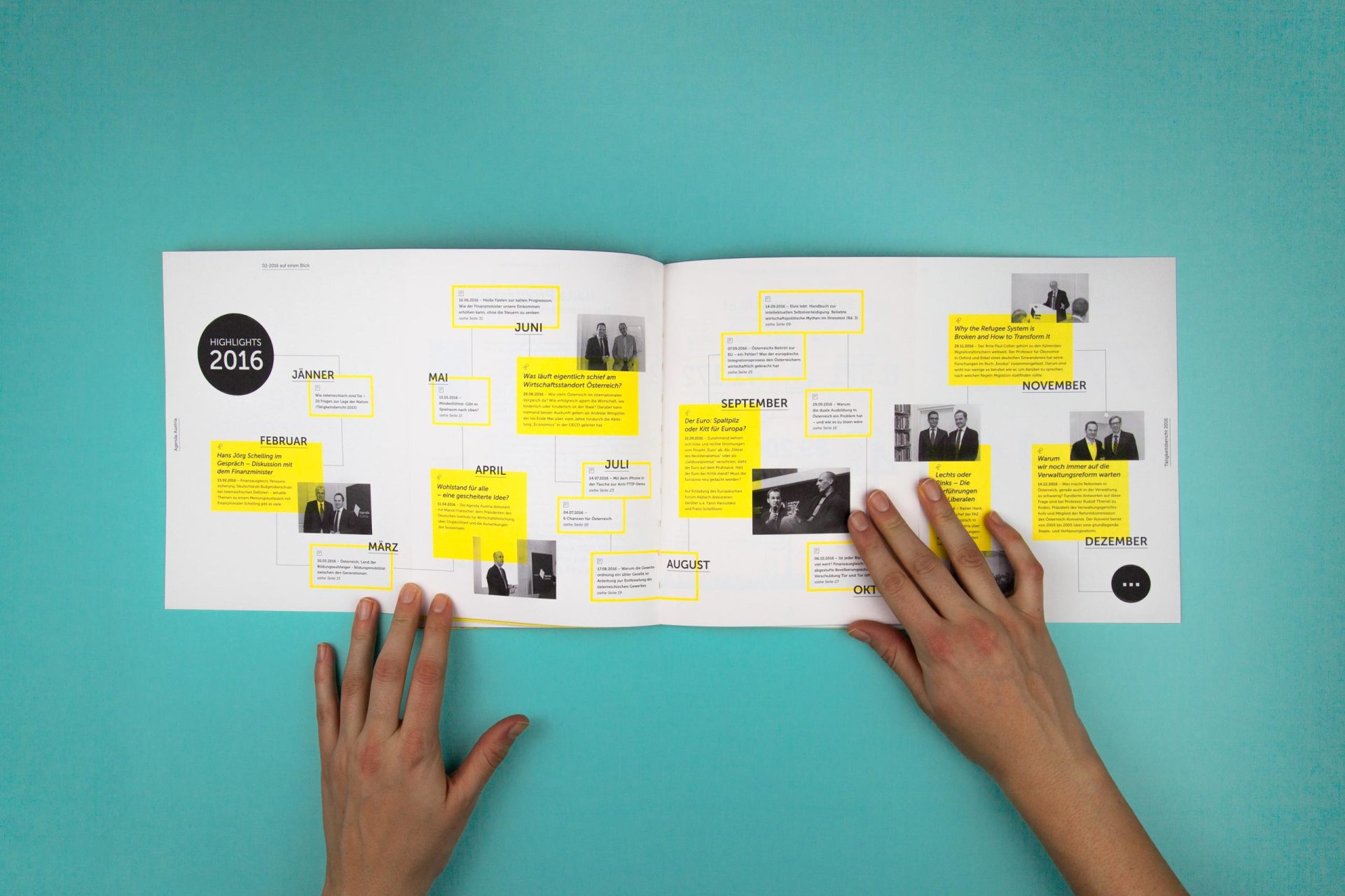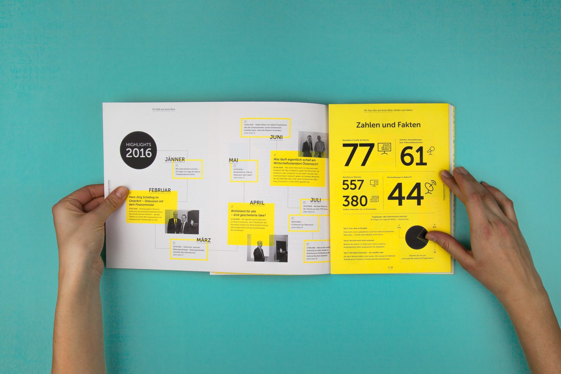 Die Agenda Austria ist eine Plattform, die sich viele Gedanken um die Zukunft Österreichs macht. Ein Think Tank also, und damit ein Partner, der nicht nur für neue Ideen offen ist, sondern solche auch einfordert. Daher hat sich die Agenda Austria auch nicht gewundert, als wir ihren Tätigkeitsbericht „Wirtschaft ist, wenn man es trotzdem macht“ genannt haben. Oder als wir in der Gestaltung auf eine Signalfarbe wie Gelb gesetzt haben. Oder als wir Peter Kufner, einen der begnadetsten Karikaturisten des Landes, mit an Bord geholt haben. Ja, so muss Wirtschaft.