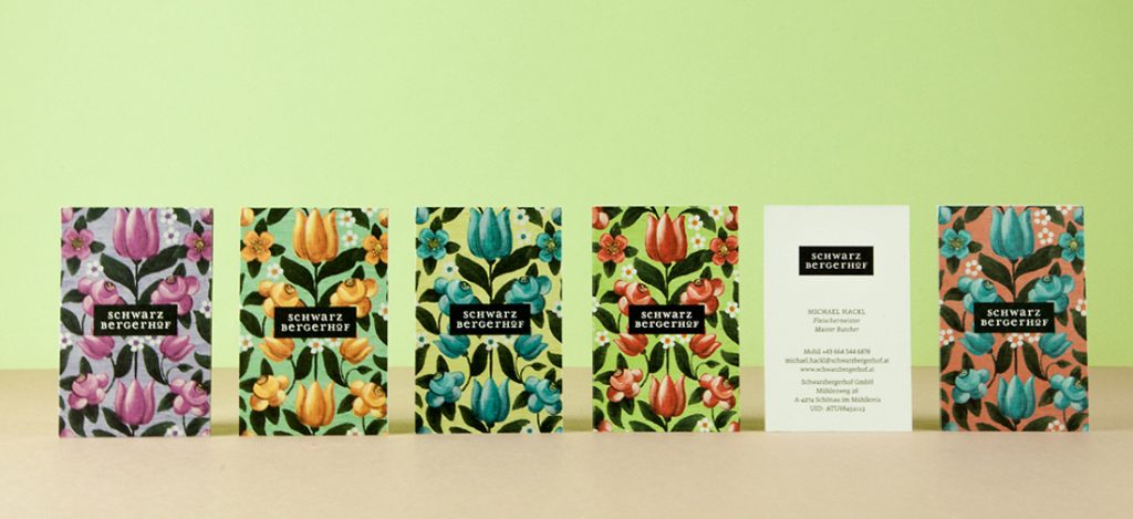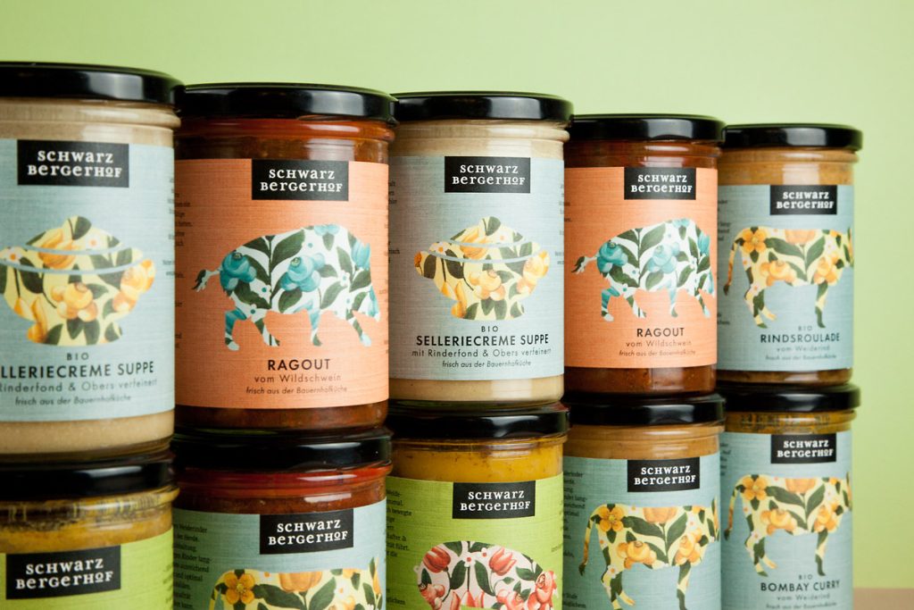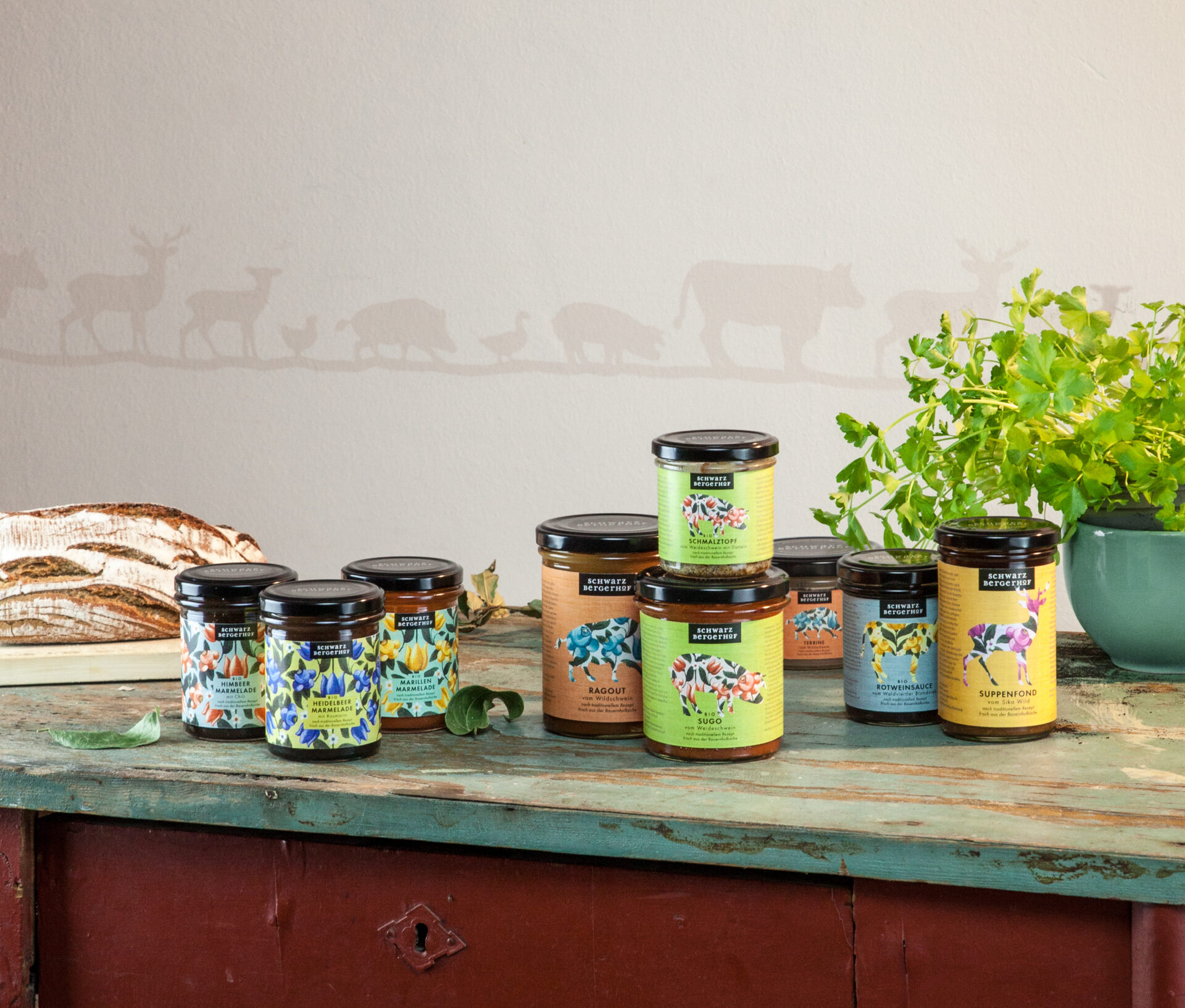 Der Schwarzbergerhof im Mühlviertel ist ein Vorzeigeprojekt aus dem Bio-Bilderbuch: Alte Tierrassen werden im Herdenverbund gezüchtet und gehalten; geschlachtet wird ohne Transportstress am Hof; verwendet wird, was da ist, also alles – From nose to tail. Auf Deutsch: so wie früher. Um diese Ursprünglichkeit und das Selbstverständnis des Schwarzbergerhofs zu verdeutlichen, haben wir uns beim Packaging Design der schon fast verloren gegangen Bauernmalerei bedient. So erhält Naturbezug und nachhaltiges Arbeiten einen ganz frischen Anstrich. Hintergrundfarben, Piktogramme und Bauernmalerei korrespondieren und kleiden die köstlichen Sugos, Aufstriche und nun auch Marmeladen. Mahlzeit!