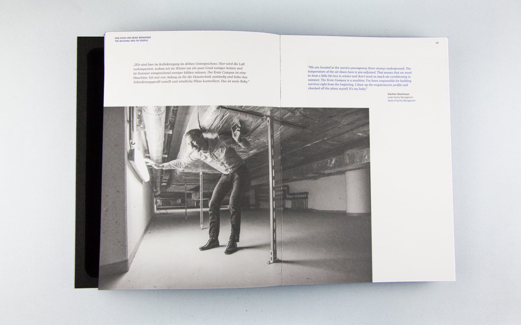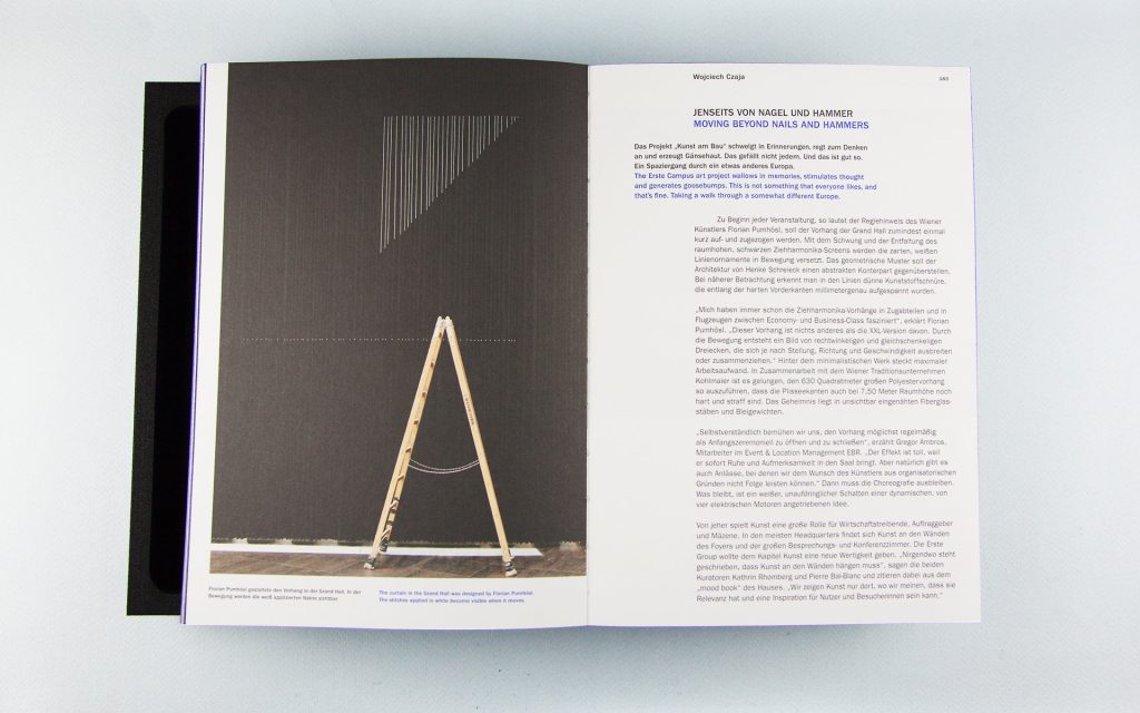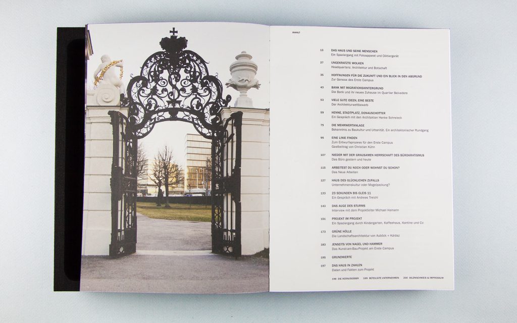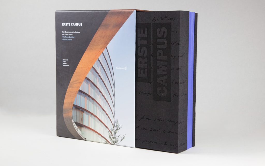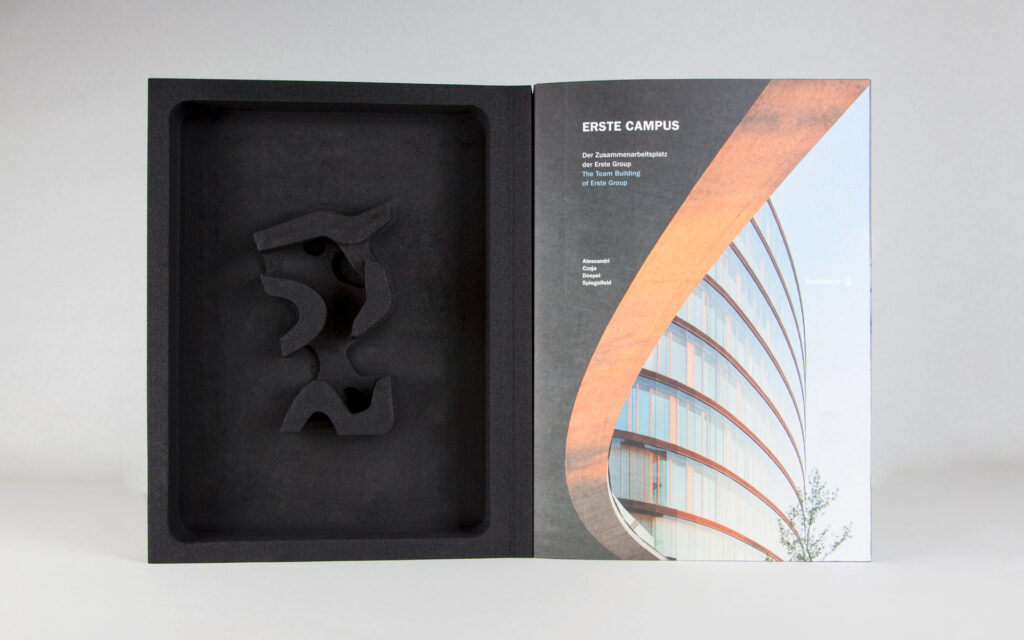 EditorialWe have commemorated the Erste Campus, the Erste Group’s new home and a project of the century, in a publication. We took the book’s motto, ‘How architecture can transform a company’, to heart and, among other things, demonstrated how a cover can transform a book: the book’s foam cover contains a faithful 3D model of the Erste Campus. It’s something you can touch and marvel at.