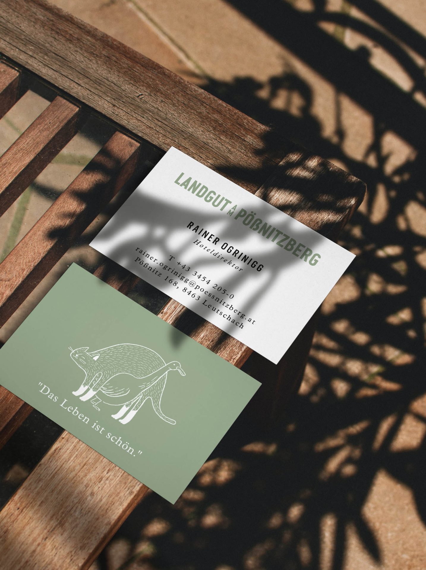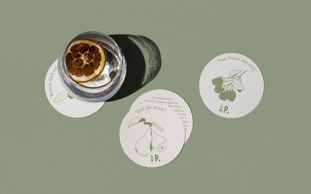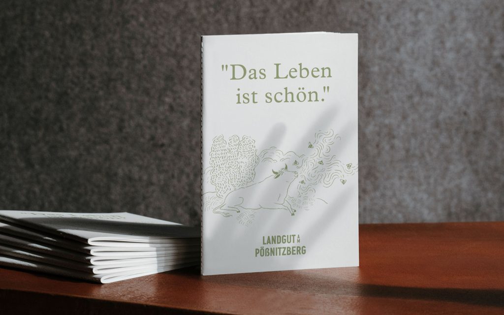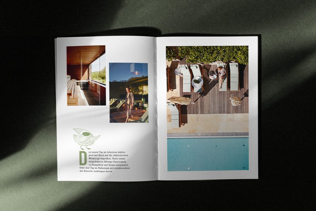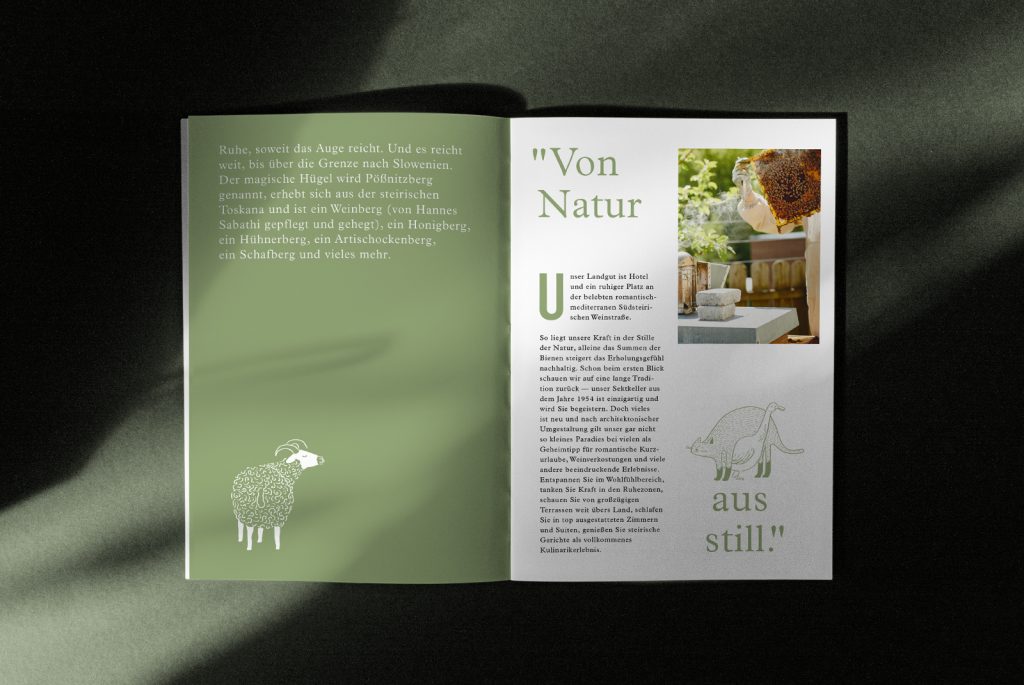 The corporate design we’ve developed for the client, captures this mood of laid-back feeling. Little tranquil moments in the countryside, captured in playful line drawings and quintessentially Styrian words like ‘pritscheln’, ‘kuscheln’, ‘schwitzen’, ‘aufgabeln’ and much, much more.