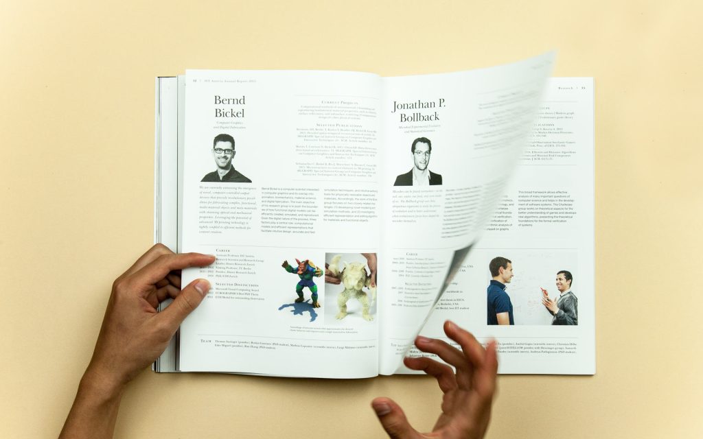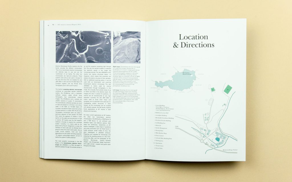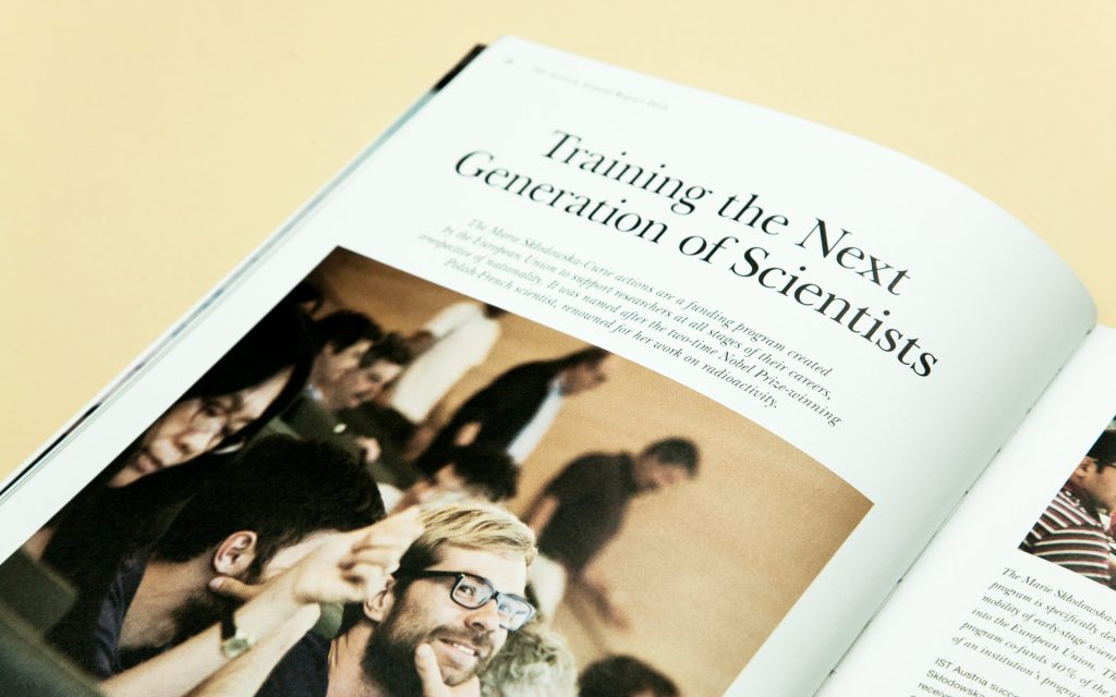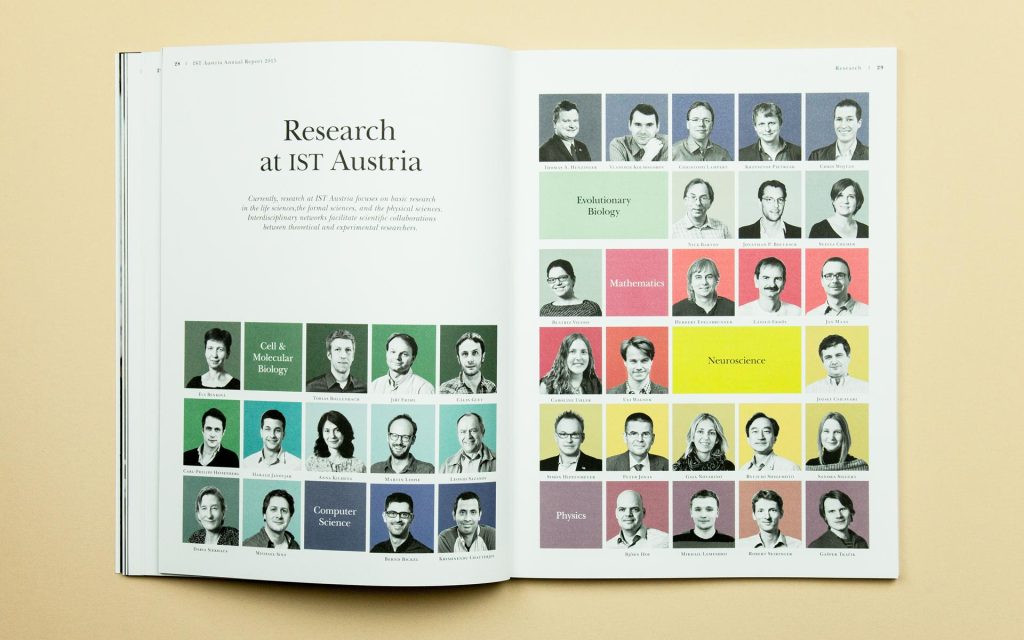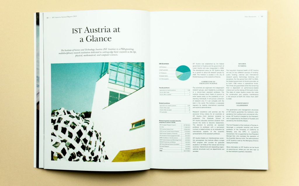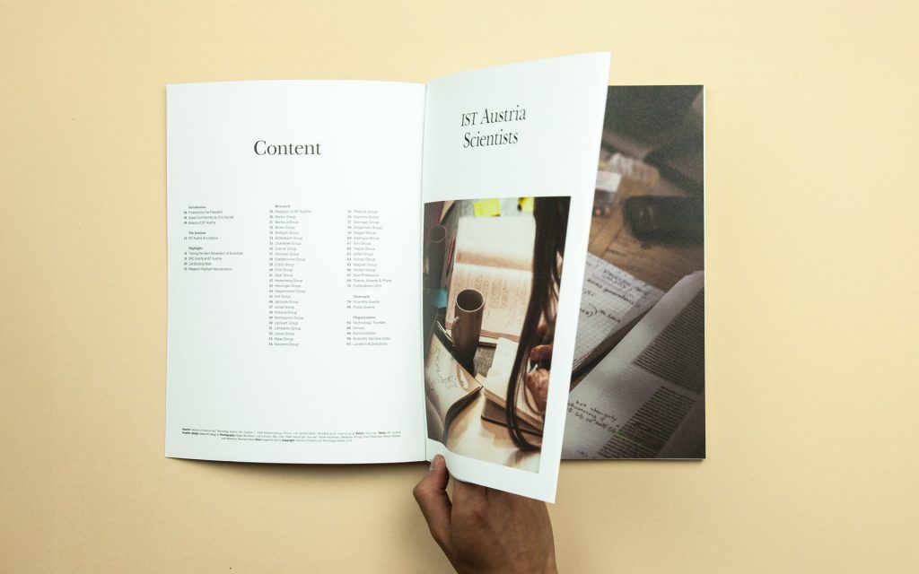 In just a few years, IST Austria has established itself as one of Austria’s best-equipped research centres. International diversity is key: professors, postgraduate students and postdocs come from every continent. The images in the annual report were taken directly on campus – from the well-attended lecture theatre to a glimpse of a notebook filled with notes. The visual style remains consistently classic and modern, offering a look over the researchers’ shoulders and thus showcasing science up close.