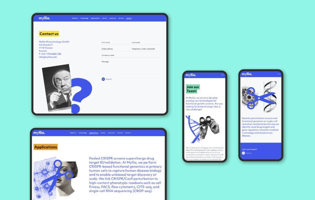 There are very few biotechnology companies worldwide that are as adept at deciphering cellular processes and breaking new ground in drug development as Myllia from Vienna. We also believe there are few that treat their business partners with such sensitivity. For us, at any rate, it was an uplifting feeling to be able to help shape the future of medicine, even if only a little, through this new website. Our idea of translating highly complex processes into simple visual compositions was supported wholeheartedly, and so it came to pass that on the website we cut human DNA into pieces and reassemble it with every click.