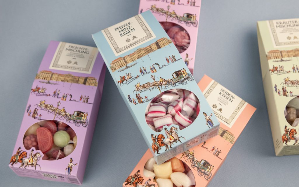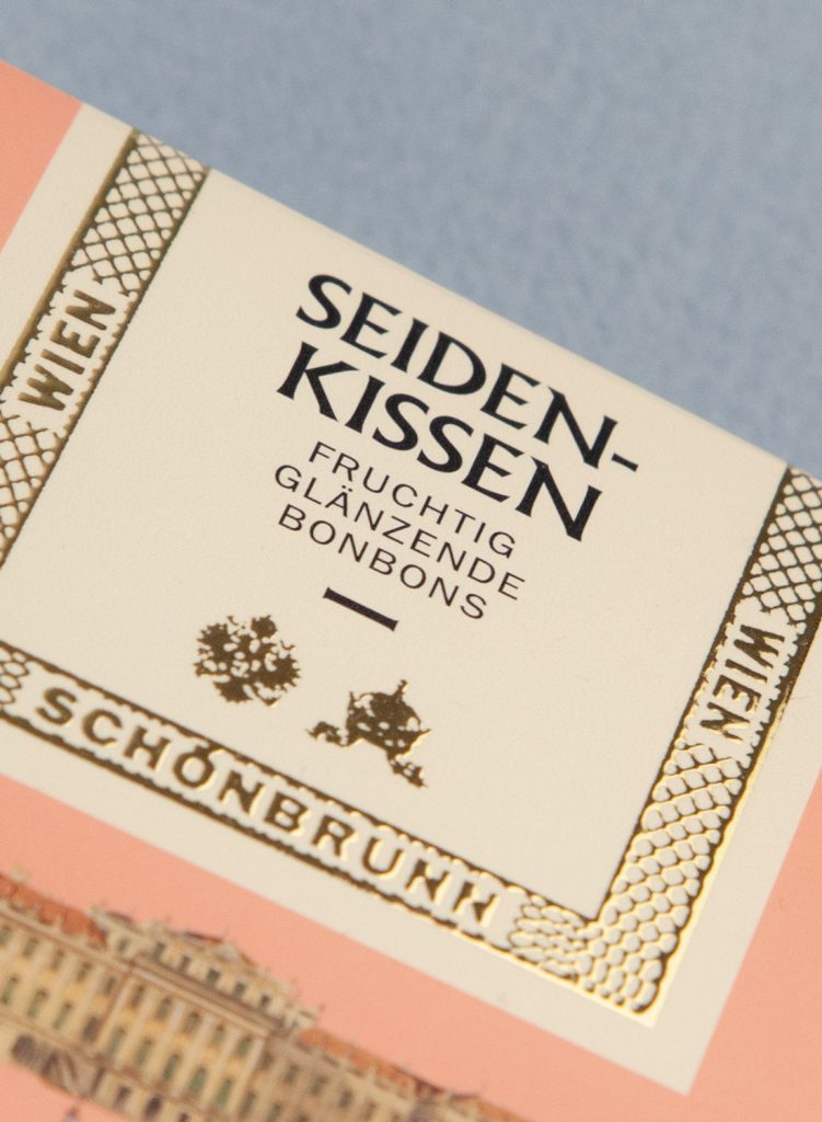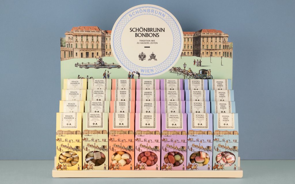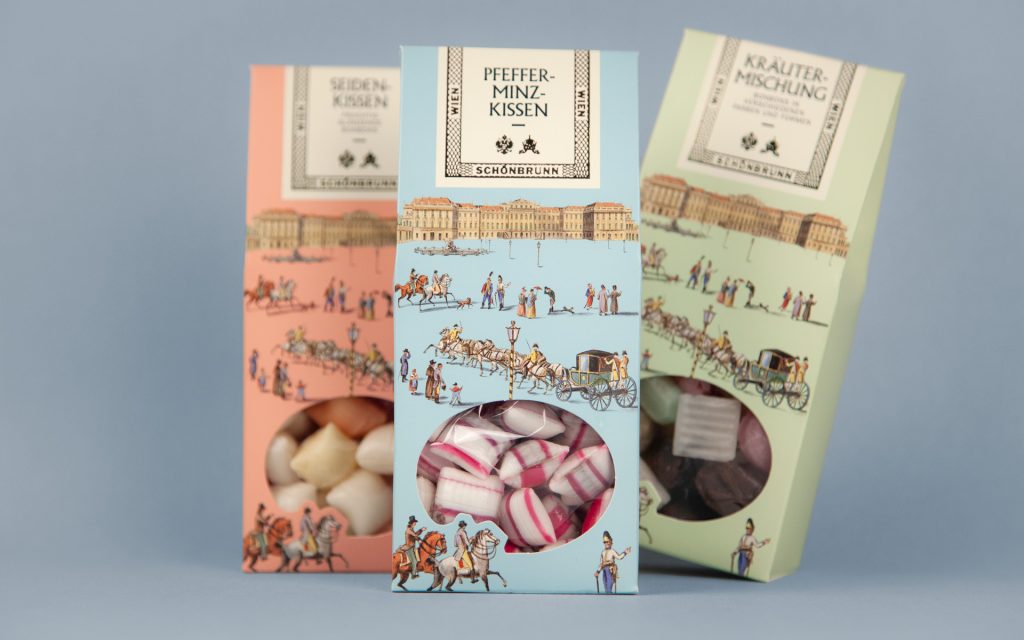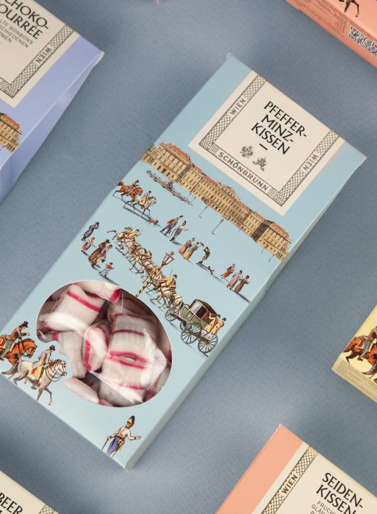 PackagingFrom Krachmandeln and Schoko Fourée to Pfefferminzkissen, there are seven varieties of traditional Viennese sweets, also known as bonbons, which were the first to be redesigned in the new corporate design for the shop at Schönbrunn Palace.
