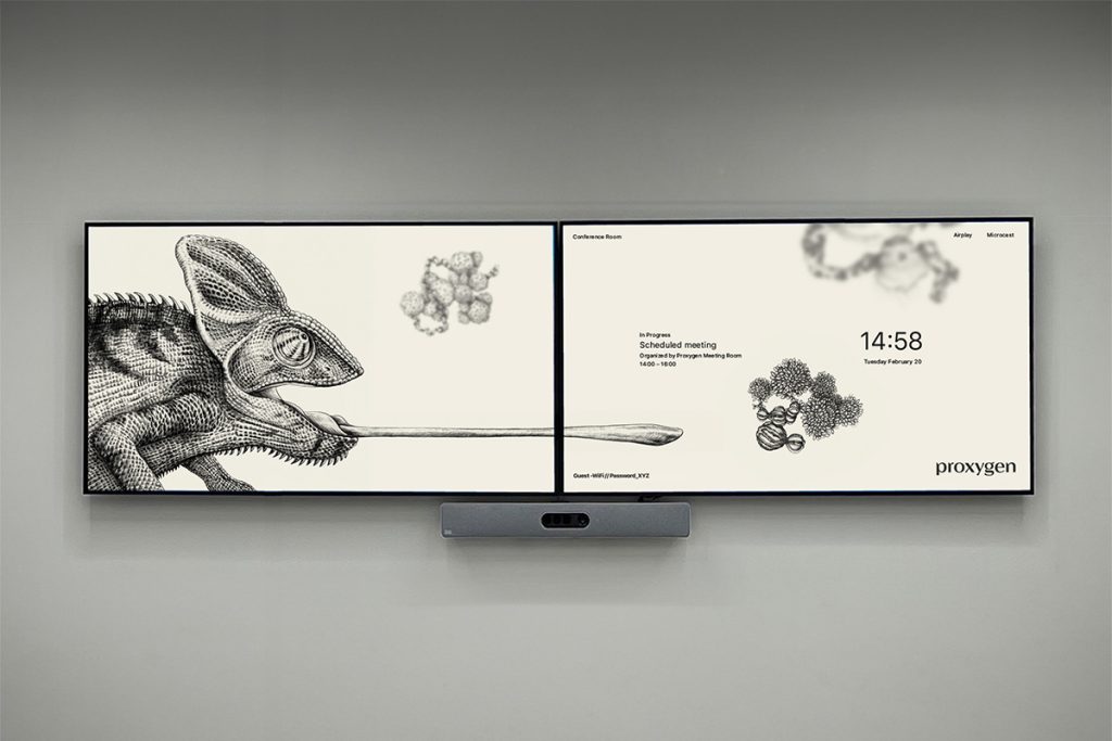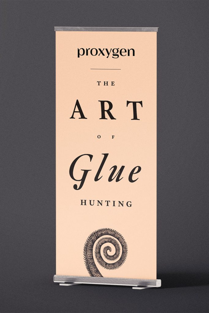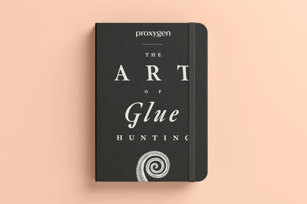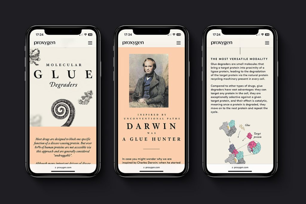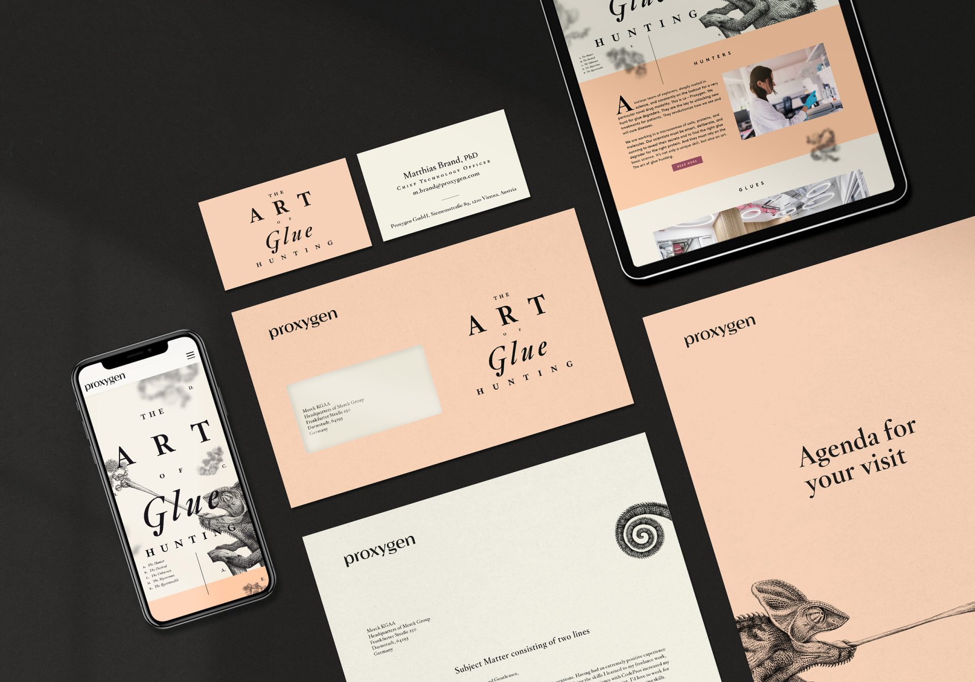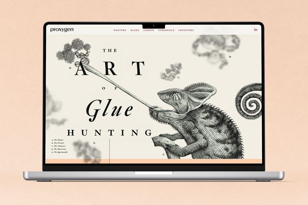 The visual communication of pharmaceutical and biotech companies is largely confined to a sterile world of laboratory photos and molecular chains. At Proxygen, we contrast this with the world of Darwin’s voyages of discovery: featuring the chameleon, which uses its sticky tongue to catch proteins, and the typographical world of early scientific publications.