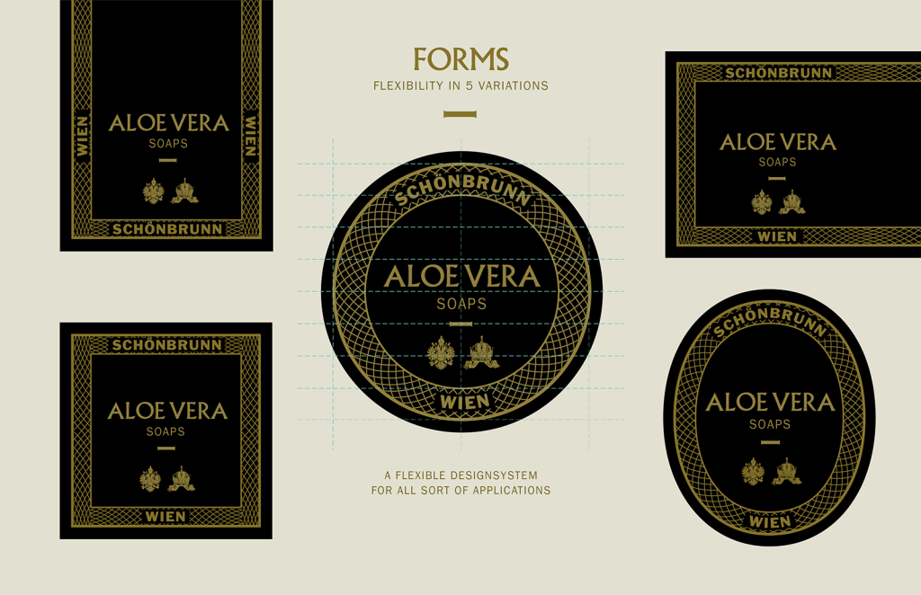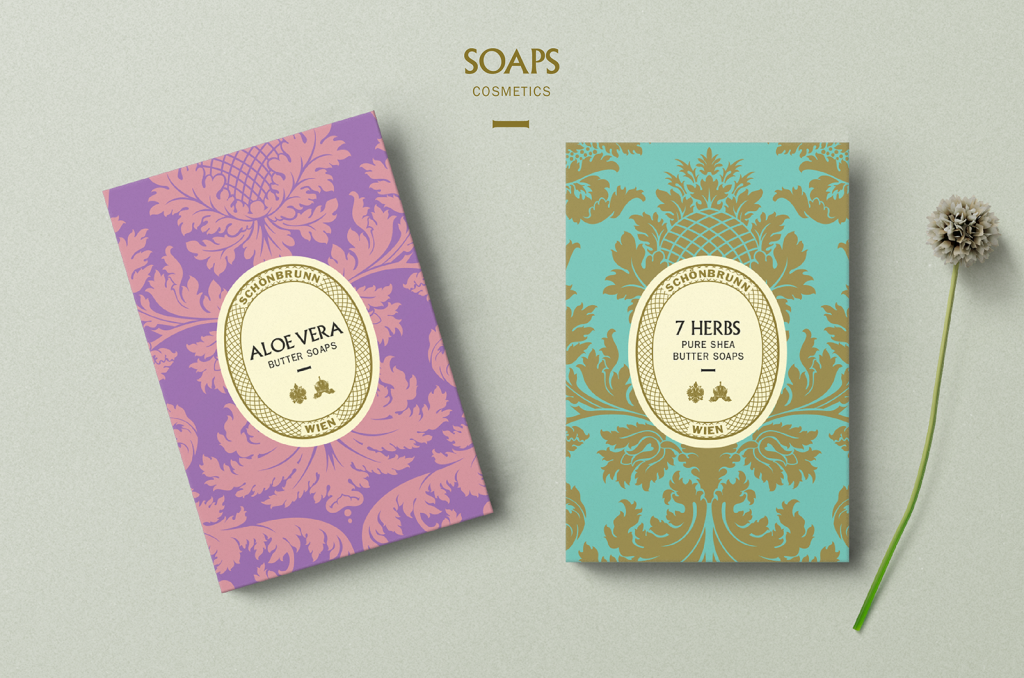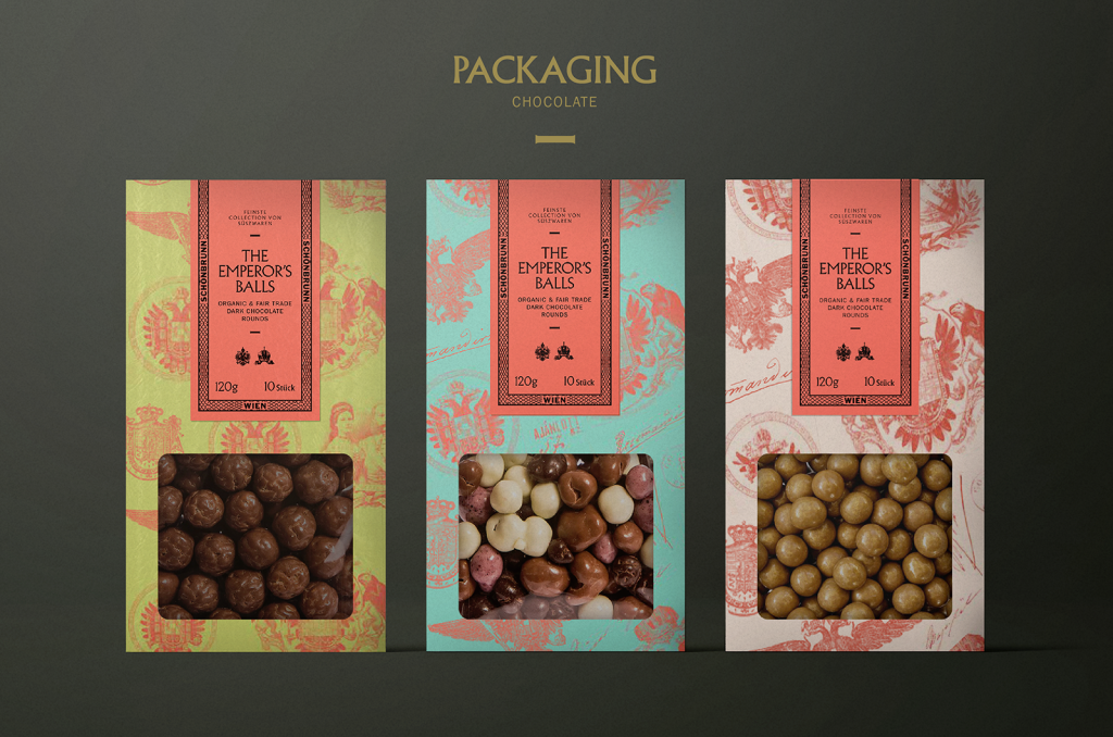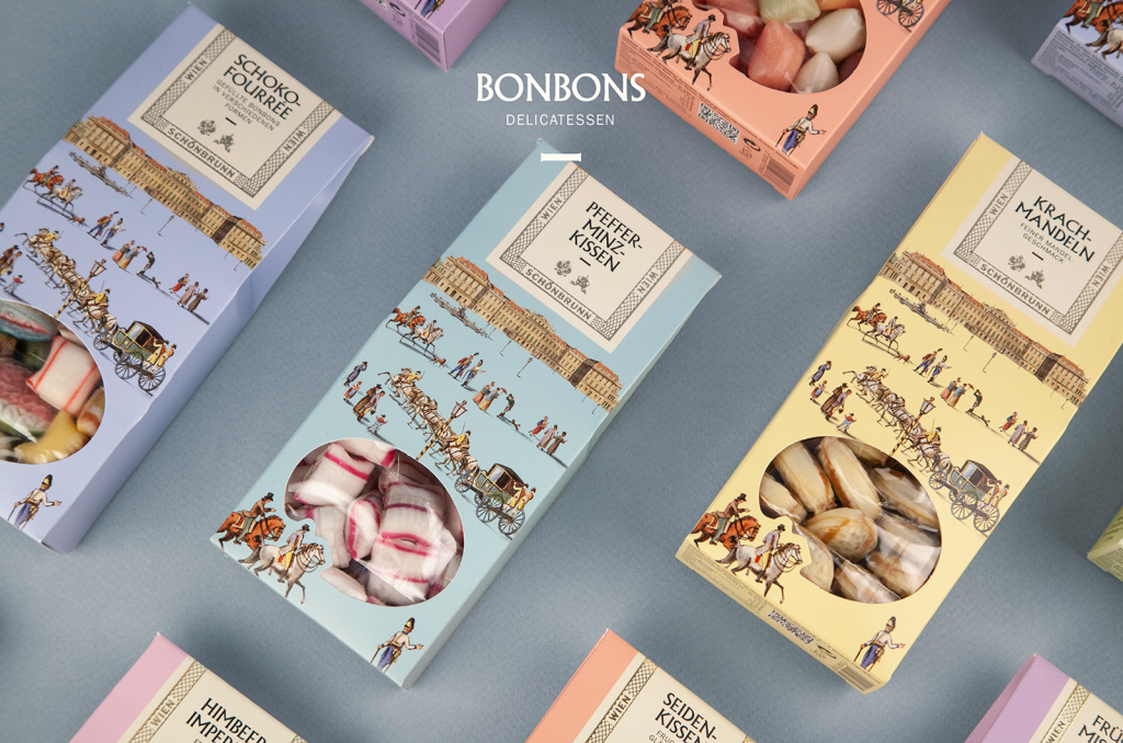 Polygonal, rectangular, round, oval, on boxes, packets and banderoles. Added to this is a recurring colour palette and a varied world of illustrations that creates a tongue-in-cheek spirit which, in our view, fully lives up to the reputation of Schönbrunn (and thus Austria).
